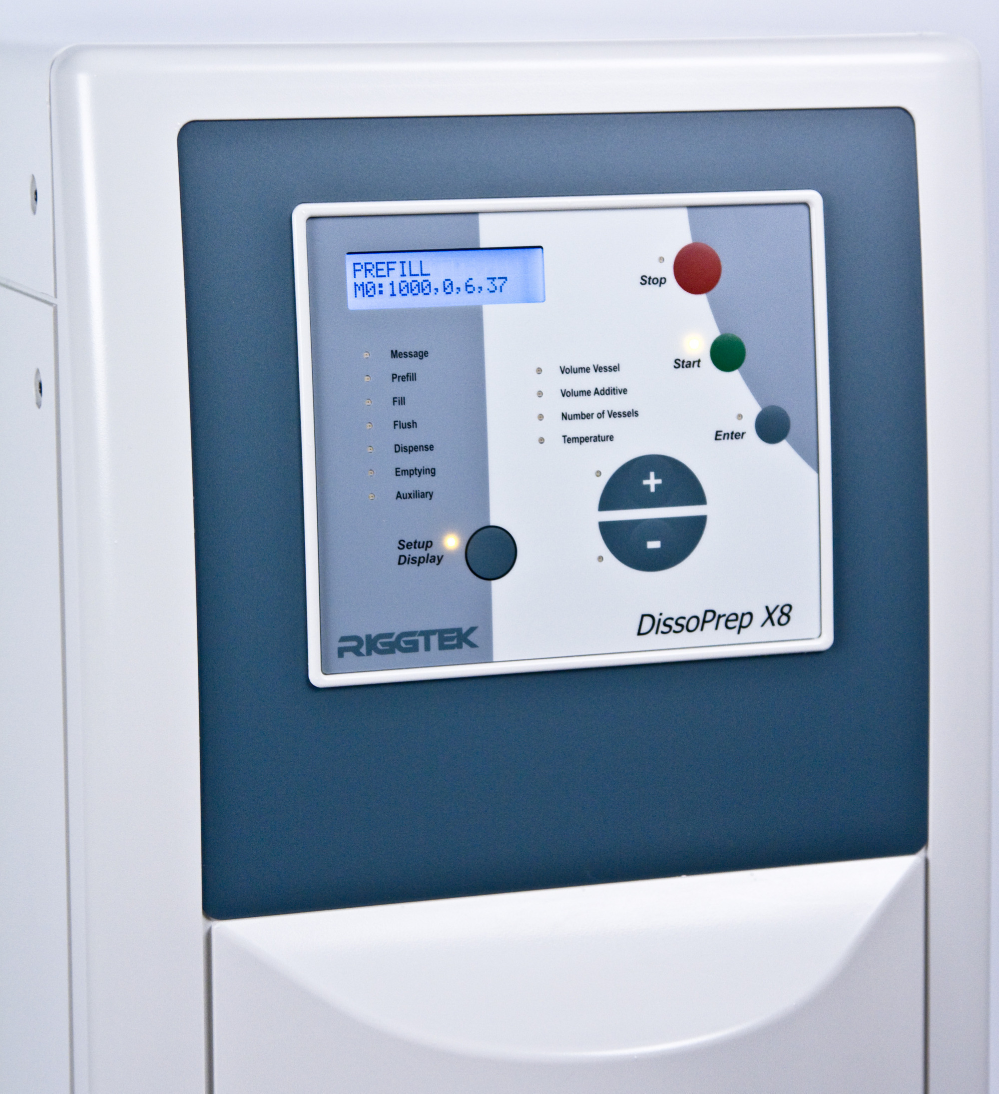 Damit können bei identischen kompakten Abmessungen des DissoPrep X8 » gleichzeitig bis zu zwei Dissolution Tester befüllt werden. So ist die DissoPrep Serie flexibel für alle möglichen Einsatzzwecke und mit dem einmaligen Arbeitsprinzip Ihr Garant für eine bequeme und hochpräzise Mediumaufbereitung und -dosierung.